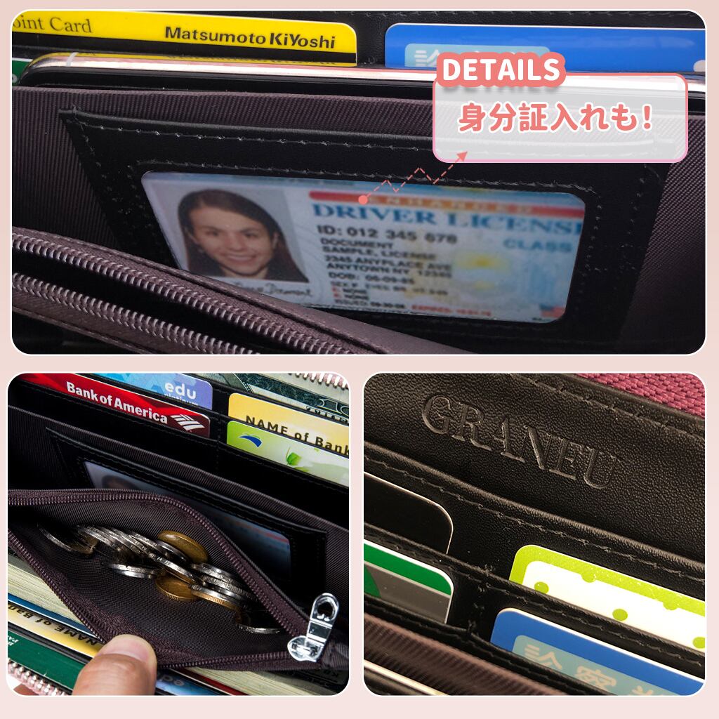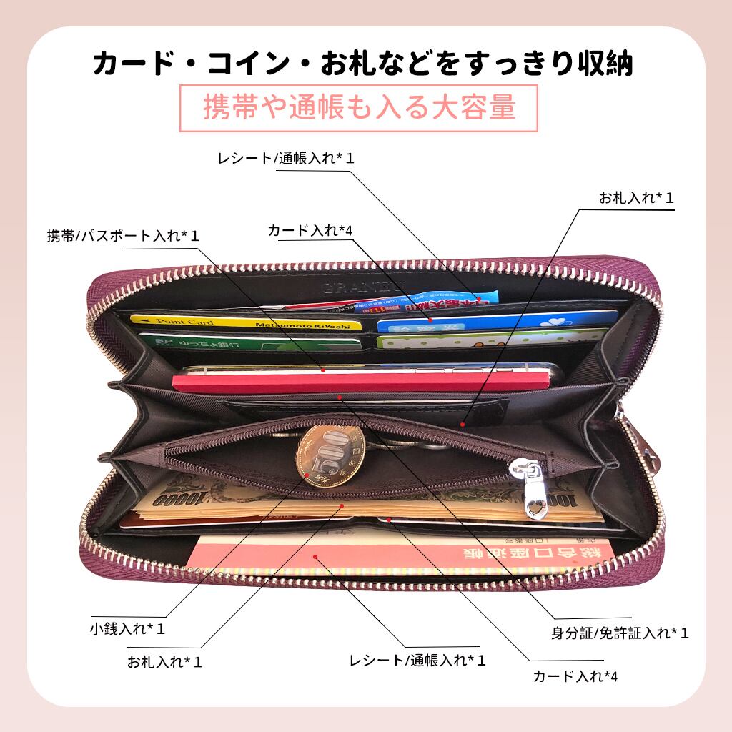 携帯(通帳も)入れ*1/お札入れ*2/レシート入れ*2/身分証入れ*1/カード8枚収納//小銭入れ×1/外ポケット×2